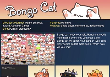 Bongo Cat Bongo Cat is a cute clicker game that puts a little cat on your taskbar. Every time you press a key on your keyboard or click your mouse, you'll get a point. Every 30 minutes, you can turn in 1,000 points to get a random new item to dress up your cat with. The game even recently got a multiplayer update, so you can see your friends' bongo cats as well. Developer/Publisher: Mercel Zurawka, Julius Krüger/Irox Games Genre: Clicker, productivity Platforms: Windows Features: Single player, online co-op, achievements