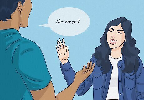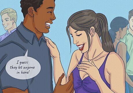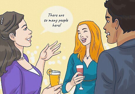 Comment on your environment. This is appropriate to do at weddings, parties, conferences, school functions—any event with a crowd. Making this kind of observation after saying “hi” can turn into talking about how many people each of you knows there, your expectations for the rest of the event, and perhaps even plans for an afterparty. Here are other examples: “There are so many people here!” “This is such a beautiful setup, isn’t it?” “Wow, everyone here cleaned up nicely!” “What a lovely venue!” “The DJ is playing some bangers!” “Have you tried the hors d'oeuvres? They’re delicious!”